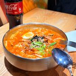 Острый корейский суп со свининой, бататовой лапшой, кимчи и тофу.