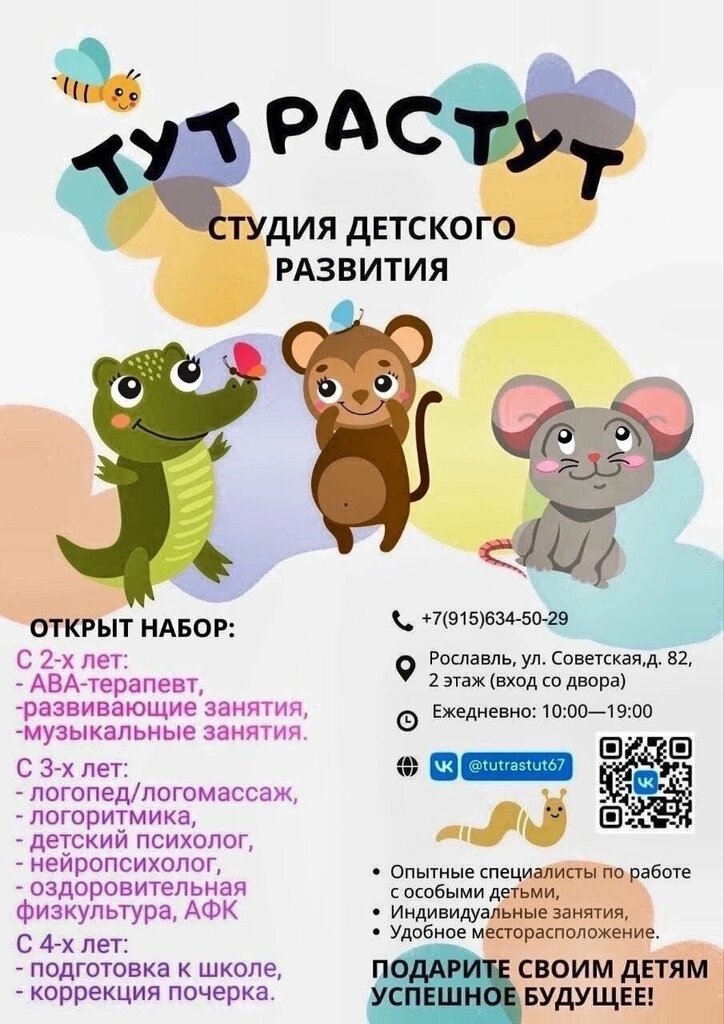 Мы посещаем кружок "Тут растут .Студия детского развития" с марта месяца, и очень довольны! Нашему ребенку (4.8 лет) очень нравятся занятия. Педагоги - настоящие профессионалы, они умеют найти подход к каждому ребенку и создать на занятиях интересную и увлекательную атмосферу. Мы видим положительные результаты: ребенок стал более внимательным, улучшилась мелкая моторика, и он с удовольствием делится новыми знаниями, полученными на занятиях. Определенно рекомендуем "Студию детского развития" Тут растут.