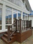 В прошлом году приобретал в данном магазине полный комплект для отделки фасада на дом и летнюю кухню - панели на фундамент, белый сайдинг 0,45 мм., сливную систему Дёке и все доборные элементы. Меня все устроило - и цена материалов и организация доставки их за город. Очень важный момент, это изготовление необходимого добора. В процессе монтажа фасада постоянно появлялась необходимость в каких-нибудь планках, уголках и т.д. Так вот с менеджером, мы согласовывали добор по телефону и я приезжал в город и забирал его уже готовым - это очень удобно! В этом году брал в этой фирме ограждения из ДПК на 2 крыльца, смотрите на фото, что получилось.