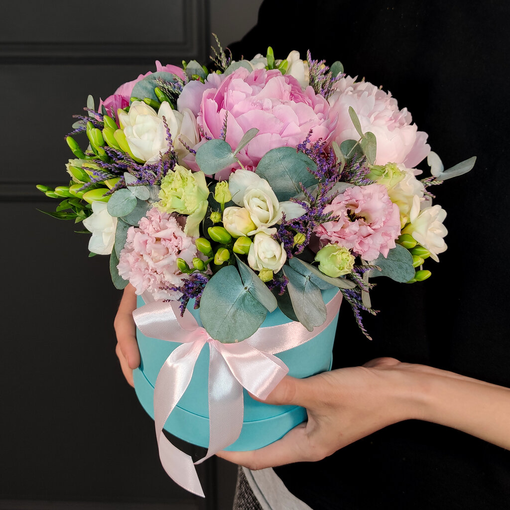 Состав корзинки: Гипсофила радужная - 15 шт. Коробка шляпная - 1 шт. Лента атласная - 3 шт.