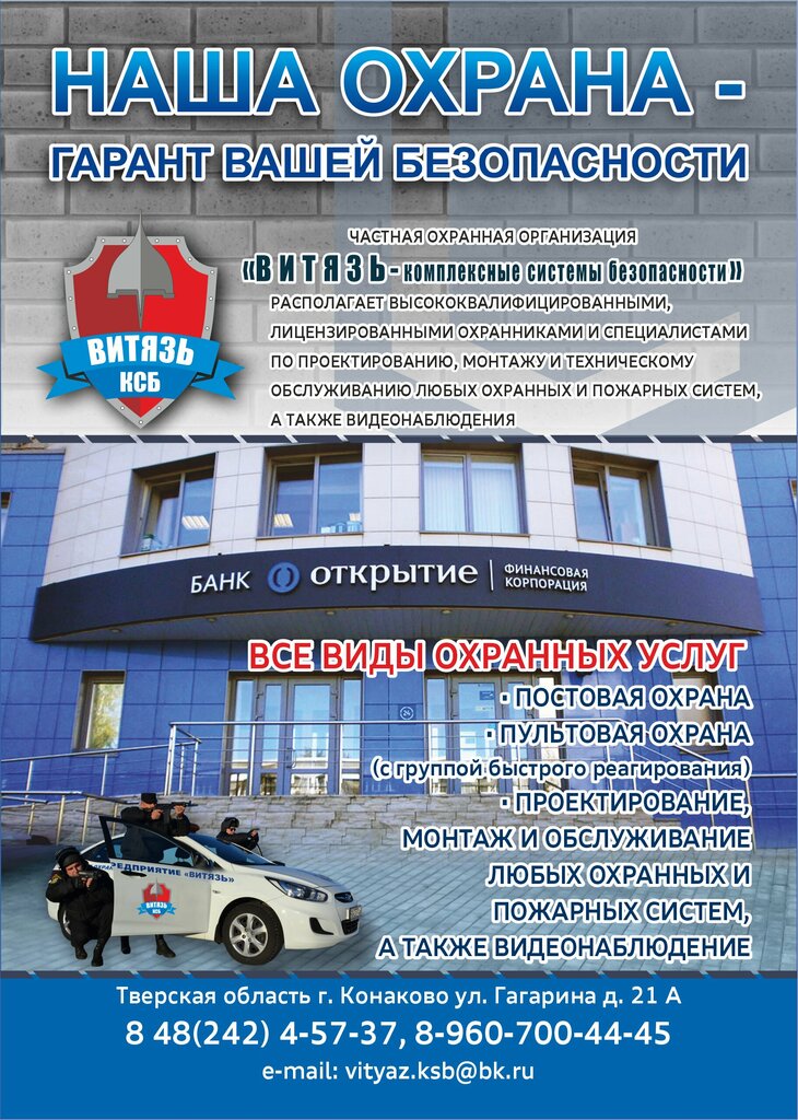 Если вам нужна охрана дома, дачи, офиса, магазина.... да чего угодно, причем ответственная и качественная, то вам сюда. Кроме этого, специалисты "Витязя" устанавливают, охранные и пожарные системы..., и видеонаблюдение.