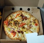 Попробовали первый раз, больше заказывать не будем. Единодушно. И не важно какие еще там вариации из названий. Огромная толстенная лепеха из дрожжевого не до конца пропеченного теста, сверху (несоразмерно количеству теста) немного начинки. Грудка, тепличные помидоры, лук и бекон. Смогла только съесть немного начинки с одного куска. Больше не захотела. Пиццу очень люблю, но это не пицца, это пирог или горячий бутерброд. Если надо наесться, то да, но получить от этого удовольствие и пользу -нет. По доставке-раньше на 20 мин.
