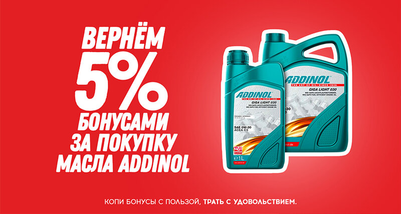 Возвращаем 5% бонусами за покупку легендарного моторного масла ADDINOL. Товары с повышенным кешбэком можно легко найти по обозначающему зна...