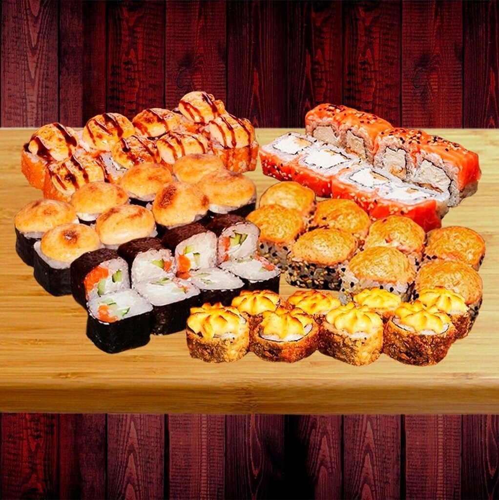 Variety of food:sushi and rolls, pizza