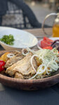 The restaurant is located in a beautiful building with a beautiful terrace. In comfortable weather, landing outdoors is preferable. The food is no higher than 4, and some positions are frankly 3. For example, in the photo, the chuchwara is served (they are frankly all boiled). Shiraz red wine was served iced (the storage temperature of this wine was violated). A pot of tea was served incredibly sweet, without asking about it.