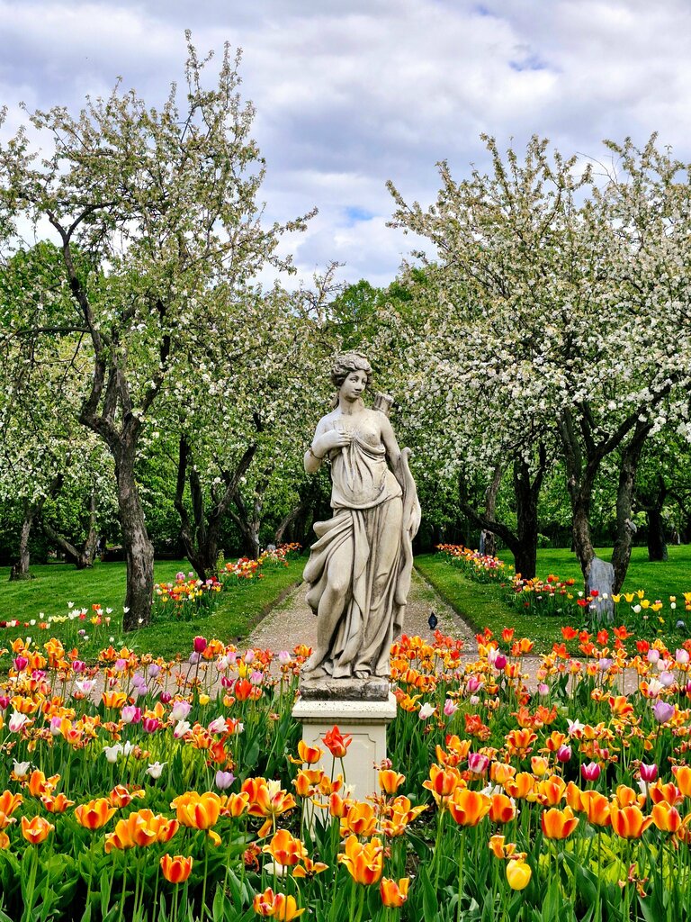Вдохновилась скульптурой и решила немного поискать информации🙃. Диана в римской мифологии и Артемида в греческой — это богиня, которая олицетворяет не только охоту, животных и растения, но и женственность, целомудрие и плодородие. Она благоволит росту трав, цветов и деревьев, благословляет рождение, свадьбы и браки. Ее брат-близнец Аполлон - бог света, в то время как саму Диану часто отождествляют с богиней луны Селеной. Вот такие разные ипостаси. Однако не просто она тут стоит в яблоневом саду)