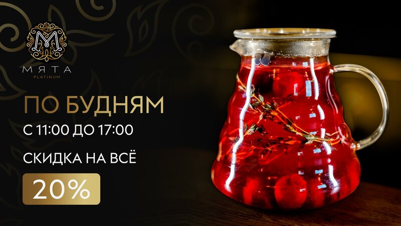 пт-чт до 17:00 действует скидка 20% на все меню, кроме кухни Присоединяйтесь к Мяте Loyalty