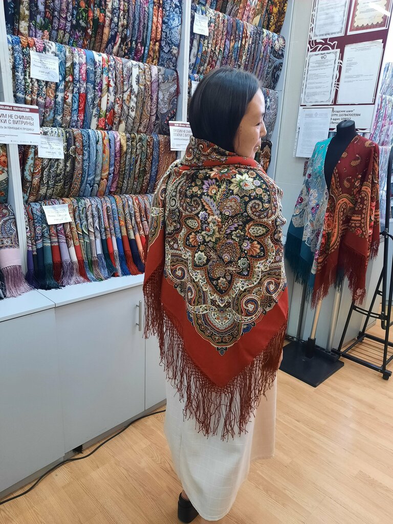 29.12.23 Вчера были с мужем платки прекрасные, не получилось купить. Это женщина продавщица не дала даже потрогать, и нормально посмотреть! Даже желание пропала что либо покупать. Хочется обратиться начальству, выбирайте продавщиц более общительных или проводите с ними беседу чтобы продавали нормально! На самом деле было ощущение как будто к этой даме домой в гости пришли! Когда приходишь покупать хочется потрогать, раскрыть платок, а если нельзя этого делать, кто захочет в слепую покупать!