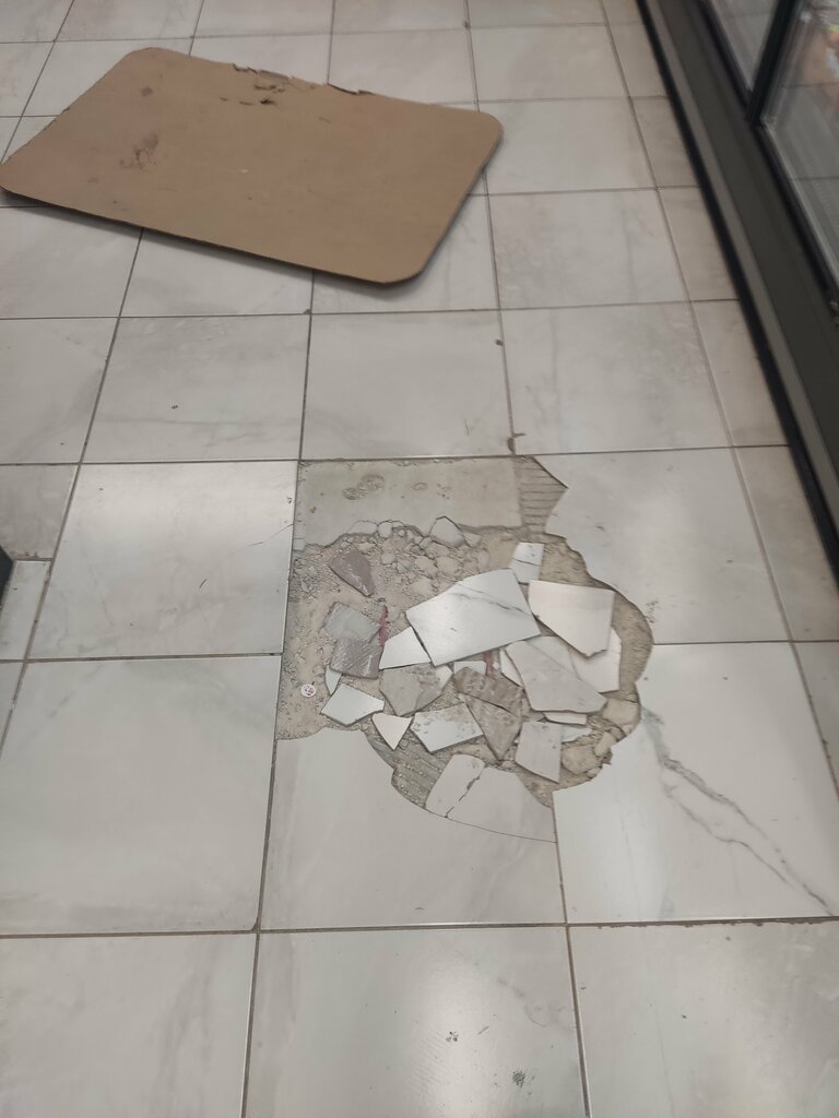 There are broken tiles in the store, covered with cardboard