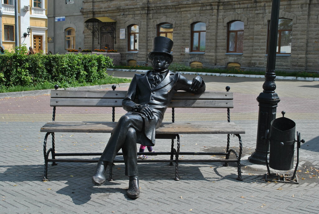 Не знаю, многие ли соотносят, но это, скажем так, «брат» Пушкина из Городского сада. Тот, один в один, сидит на скамье рядом со стоящей Татьяной. Пушкиных в Челябинске, только по памяти, минимум аж четыре. И все можно пройти, начиная отсюда — и в Сад: «кировский», копия опекушинского, самый известный (авторства Головницкого) и «близнец» у колоннады. Этот памятник довольно популярен. Наверное, каждый ребёнок, множество прохожих, гостей Челябинска норовят присесть в обнимочку с Александром Сергеевичем и сфотографироваться.