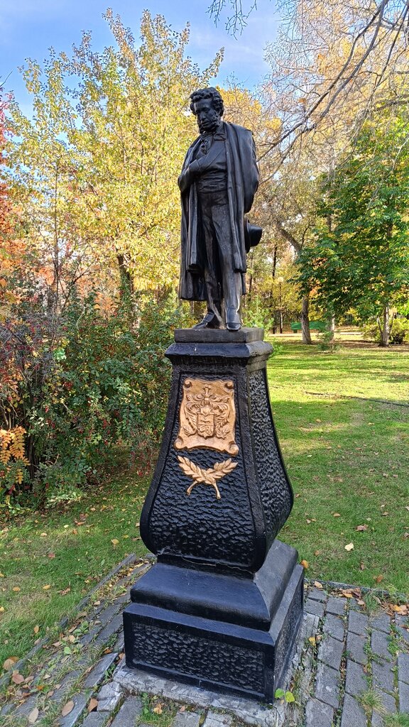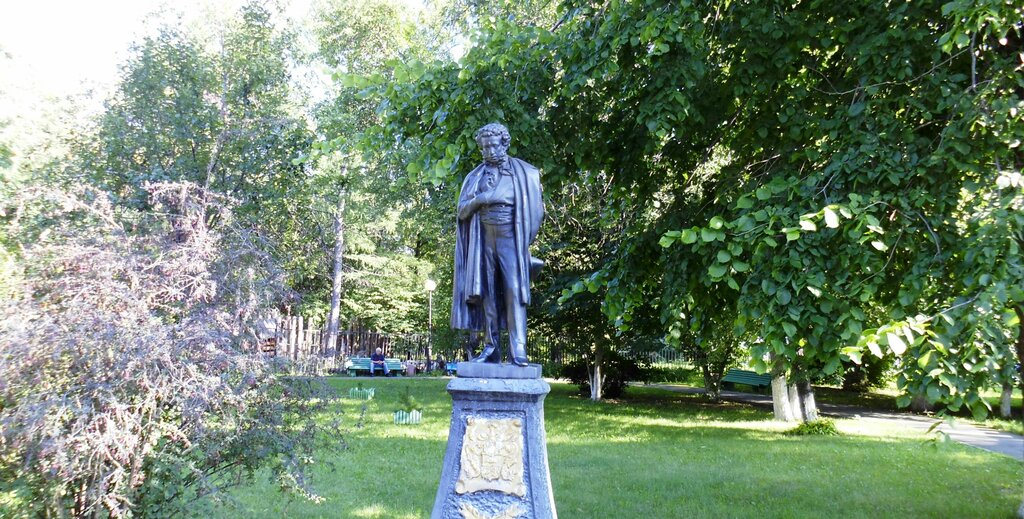 Миниатюрная, милая копия московского Пушкина авторства Опекушина. Ручаюсь, что большинство челябинцев даже не подозревают о его существовании. Стоит он так тихонечко, в закутке, и ждёт случайных прохожих. Чтобы умилиться, можно свернуть с транзитной дороги через Сад или нарочно зайти сюда. Кстати, на постаменте изображён герб рода Пушкиных.