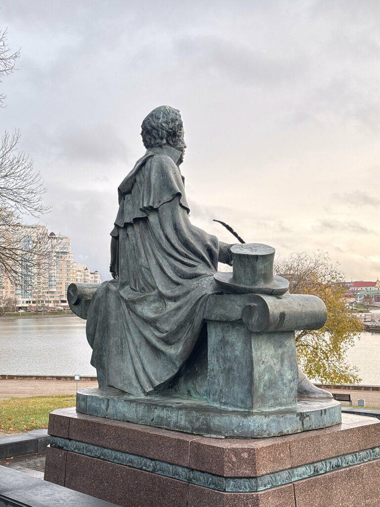 Monument to the great Russian poet on the banks of the Svisloch River. Conveniently located for photo shoots. Since it is located on a small hillock, it is also convenient for shooting panoramas of the water area.
