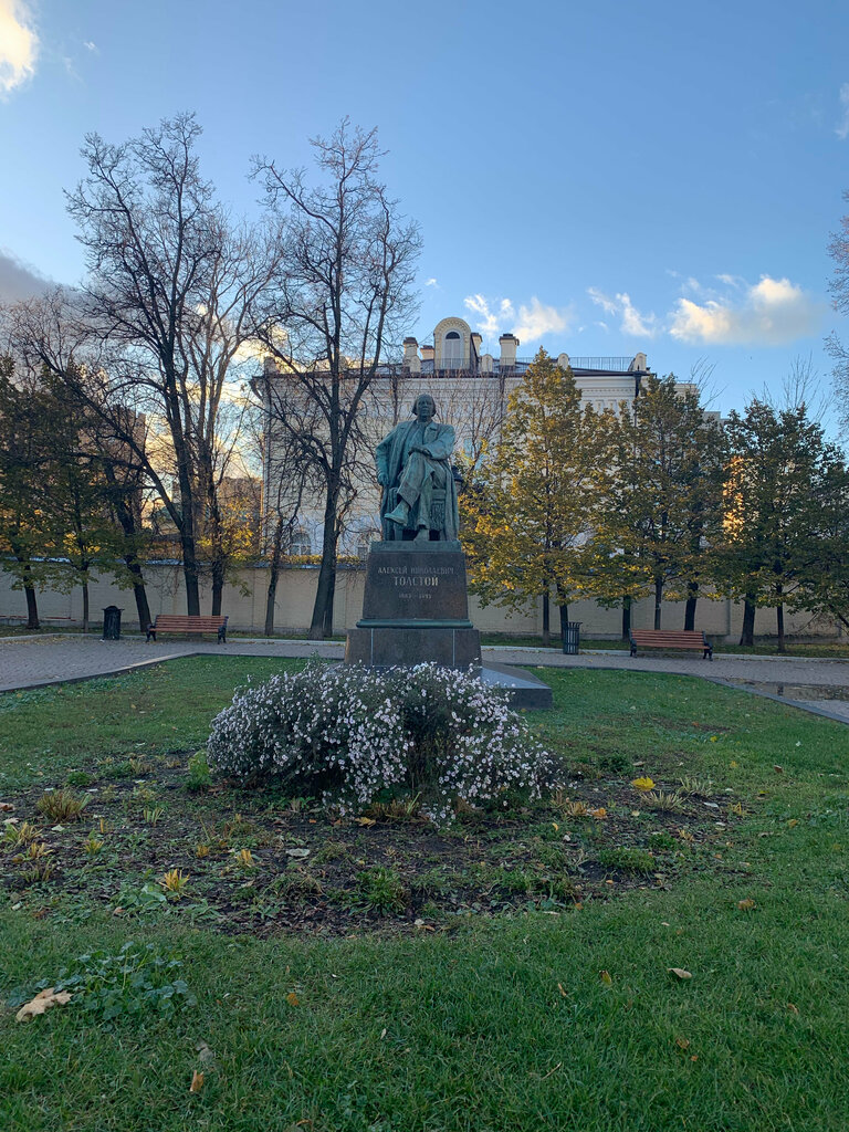 – Он совсем не похож на себя, – говорила Людмила Ильинична Толстая, последняя жена писателя. – Сидит в кресле такой… барственный господин, настоящий «красный граф». Не знав этого “господина” лично, приходится верить.  Памятник установлен на месте разрушенной в 1937 году колокольни храма Большого Вознесения, которая стояла тут с XVII века. И ему, этому памятнику, теперь обязан своим существованием милый сквер со скамейками. И славно. Вообще-то, я знаю только одну причину установки памятников писателям (ведь настоящая память о них – книги) – это возможность назначать свидания. Разумеется, лидирует Пушкин. Но возле Пушкина приходится стоять (с букетом). А нам, мужчинам за… сорок, такие “стояночки” уже могут выйти боком, то есть, скрипом в коленках. Поэтому здесь, у Толстого, – самое то! – сиди себе, жди сколько нужно. Рекомендую настоятельно. Как вам лайф-хак?  p.s. а похож на себя знаменитый писатель или нет, кто теперь рассудит?