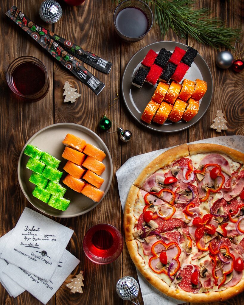 Variety of food:sushi and rolls, pizza, сhinese food
