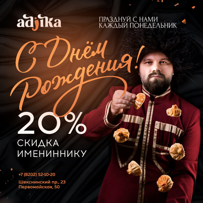 Мужская среда в «Аджике» ✨ Каждую среду — скидка 50% на всё меню* для мужских компаний от 2 до 8 человек. ❗ Условия: • Только в зале ресто...