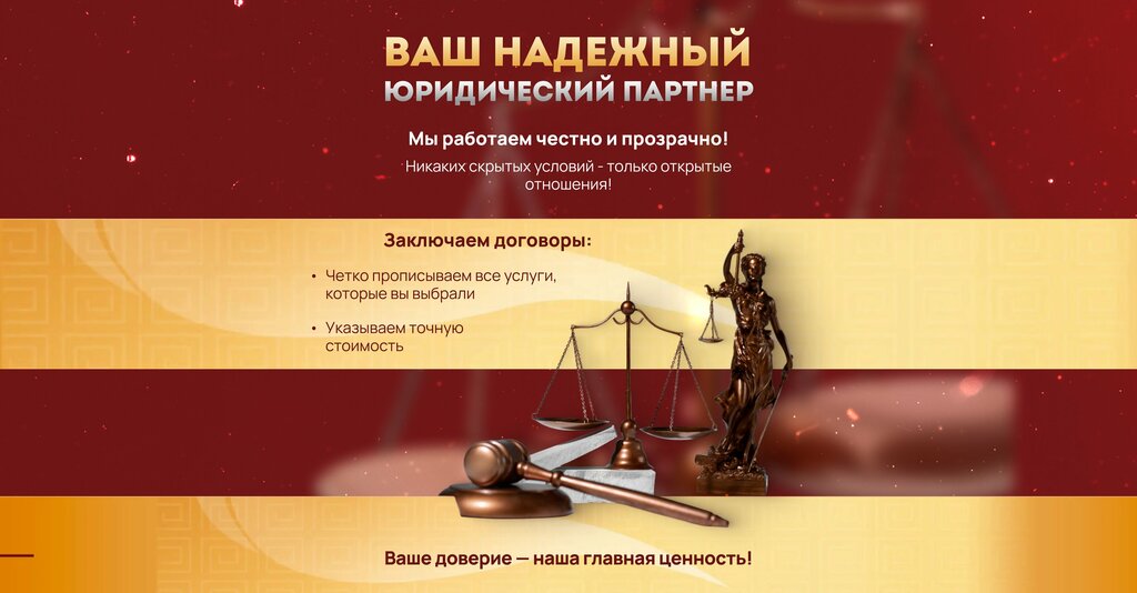 Individual sevices:personal lawyer, military service, family law, inheritance law, labor law, housing law, copyright protection, judicial fact-finding, transaction support, consumer protection, compensation for injury, land law and real estate, criminal lawyer, bankruptcy, auto lawyer, civil law, support of reproductive technologies, familiarization with the case materials in court, economic affairs, judicial representation, mediation, car purchase support, assistance in document recovery, custody, disputes with banks and credit institutions, recording of court sessions