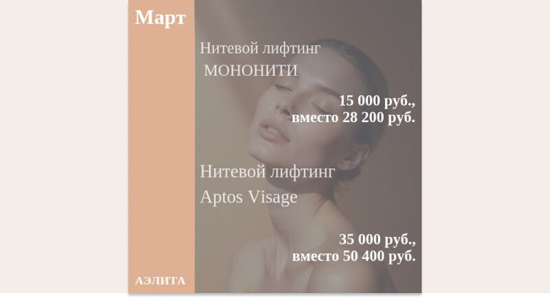 Акция в Медицинском центре косметологии Аэлита на проспекте Энгельса Нитевой лифтинг МОНОНИТИ 15 000 руб., вместо 28 200 руб. Условия акц...