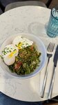 собственного посола, сметаной, миксом зелени и яйцом пашот