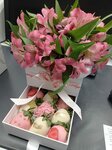Состав: шляпная коробка, 5 веток альстромерии, 250 гр ягод Ягода производства теплиц Армения с кислинкой и плотностью, именно такой сорт используется для работы с качественным шоколадом