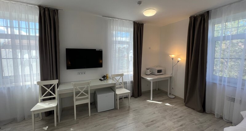 Хорошее и тихое место, забронировали через Суточно.ру. Напоминает южный берег, с гостевыми домами и узкими улицами. Мы снимали 25 номер. Из плюсов: номер чистый, красивый, есть кондиционер, холодильник, телевизор. Из минусов : плохая звукоизоляция, маленький сан.узел, под душевой кабиной подтекала вода. Есть парковка, автомобили под камерой наблюдения. До исторической части города добирались на такси, быстро и удобно. Приеду ли я ещё раз сюда, скорее всего да, переночевать хорошее место, но мне не хватало растительной зоны и уютного сада, а так же большого зеркала в номере, но это только мои желания и предпочтения, поэтому рекомендую!