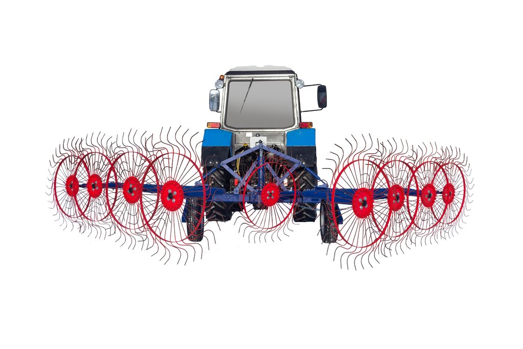 Грабли ворошилки валковые, для сгребания травы в валки, 8 колес, ширина захвата 6 м. Грабли используются для уборки сеянных трав, а также трав естественных сенокосов урожайностью свыше 10 ц/га на равнинах при влажности массы от 25 до 80.