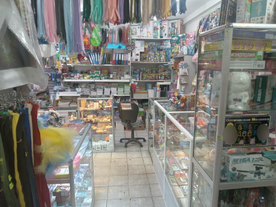 The store is near the house. A lot of school supplies, notebooks, pencils, albums and so on. Toys of all kinds! Accessories for clothes, threads, yarn, locks, cages, drinks and more. Watch repair. A photo template. Printout. All sellers are polite and friendly, the prices are very reasonable. I recommend the store!!!
