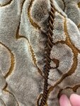 Получили из чистки покрывало. Потеряло и цвет и форму. Видимо, была неправильно но выставлена температура - отсрочка тесьмой "села" и собралась ткань вокруг, да ещё и покрасилась и возле самой тесьмы и по полу, как было сложено. А к покрывало приложили бумажку, на которой написано, что степень загрязнения "очень сильная" и пятна неопределенного происхождения", чего при согласовании не указывали. В общем хорошая когда-то химчистка выродилась в ту же "Диану", только с претензией и дороже.