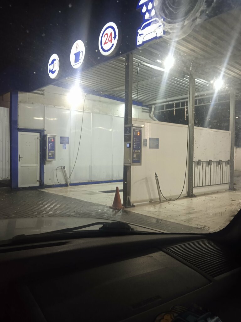 Мойка на которой можно просто сбить грязь с машины, химия так себе, время заканчивается быстро, химия которая якобы бесплатно, просто отсутствует, стоять в очереди ужасно не удобно из за газовой заправки, ну а так в целом помыть машину после трассы можно)