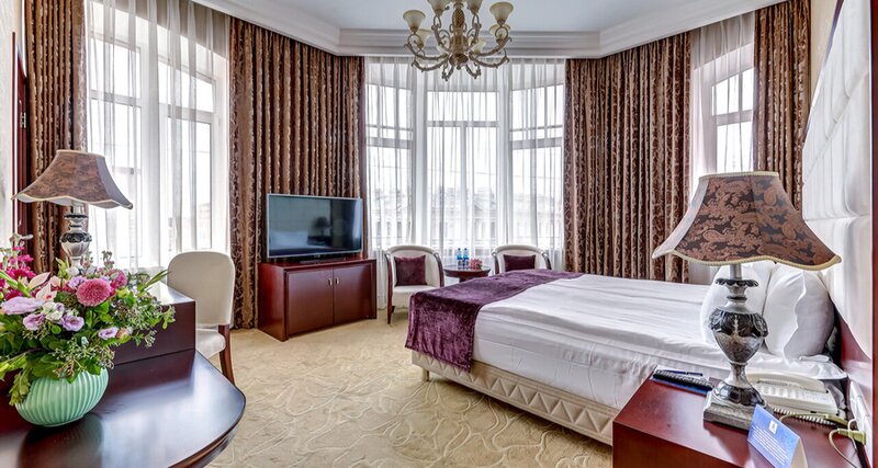 В номерах категории Стандарт двухместный есть все необходимое для комфортного пребывания. Возможно размещение на одной большой или двух раздельных кроватях. Площадь номера составляет 16 м². Интерьер выполнен в классическом стиле.