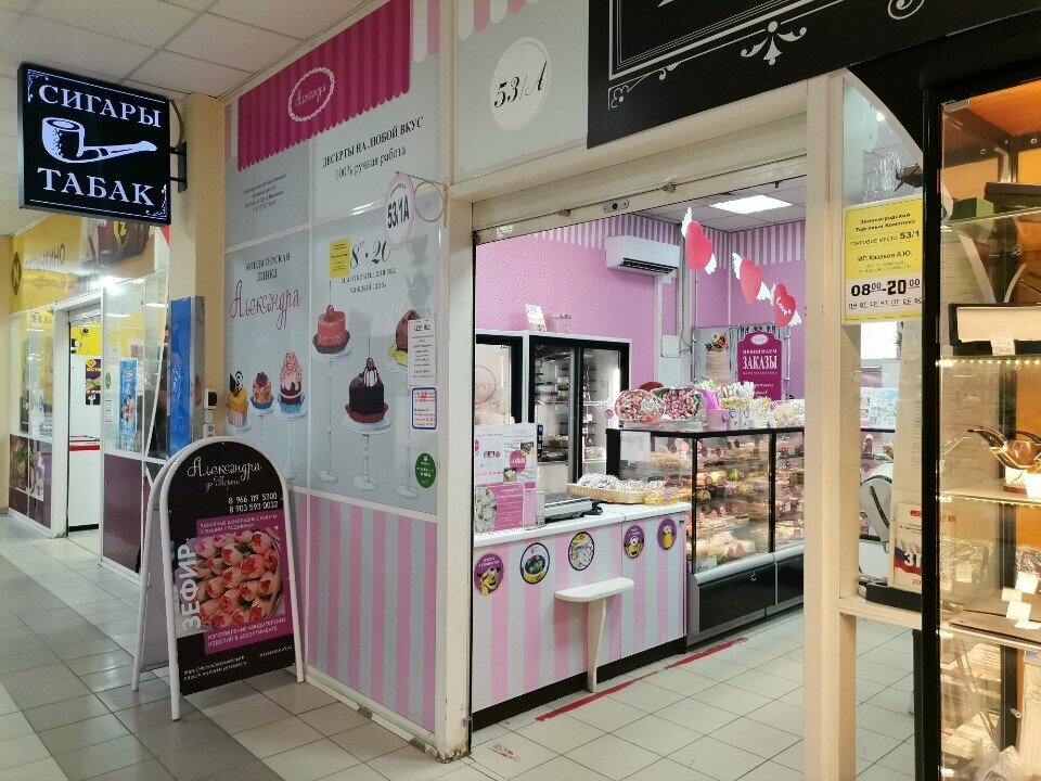 Очень вкусные торты и пирожные, всегда хороший выбор, адекватные цены, в отличие от "Палыча", и очень широкий ассортимент в отличие от "Русского леса" (хотя "Русский лес" тортики тоже очень люблю и ценю). Из самых любимых у Александры - торт "Столица" и профитроли ) обожаю ) всегда прекрасен меренговый рулет, небольшой и много вкусов. А ещё здесь самые недорогие и классные заказные торты! Хочется только поменьше сахара добавлять в продукцию, это сейчас у всех беда, переслащивается всё ( Желаем Александре процветания и поменьше сахара ))) 😘