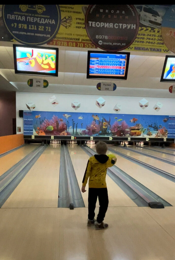 Посещали боулинг на День рождения ребенка, заказывали дорожку по телефону ,на 2 часа, пришли заказали пиццу,наггетсы, картошку фри, сырные палочки, все было вкусное, приготовили быстро, в боулинге понравилось, людей не много, дети наигрались, все прошло хорошо! Придем еще обязательно 👍