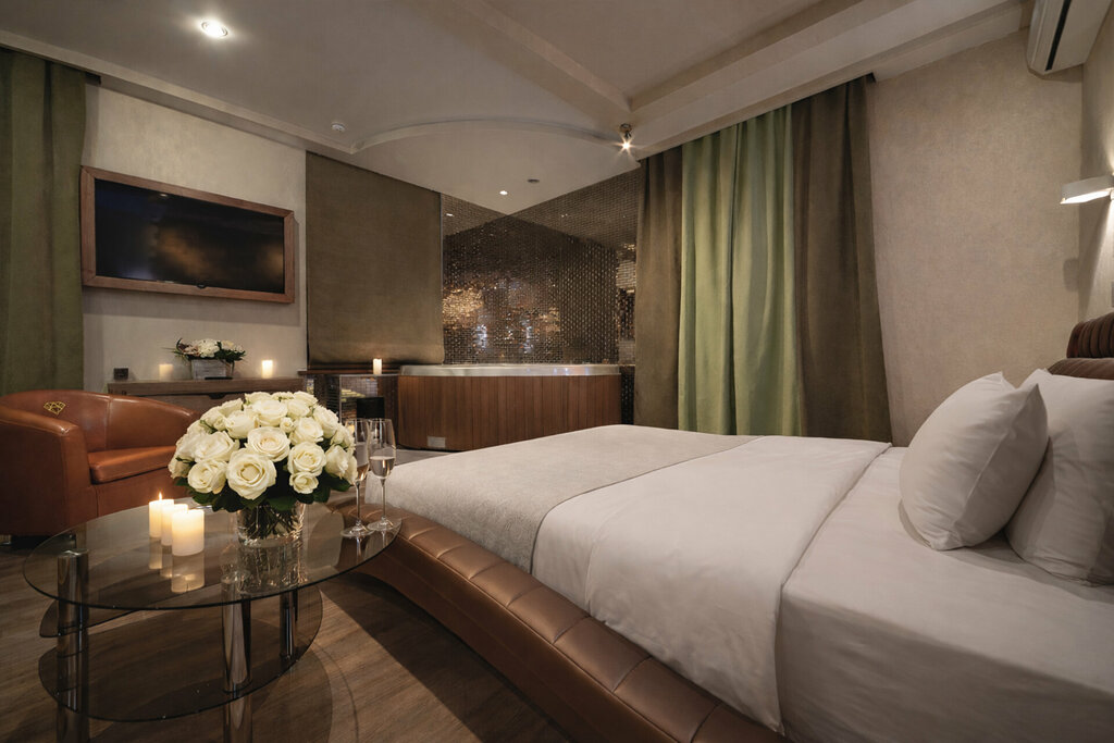 Решили с девушкой провести романтический вечер с этом отеле.Ни разу не пожалели,бронировали люкс для курящих.В номере джакузи,и просто чистейше!В наличие есть вина и прочие напитки,для заказа еды я позвонил на ресепшен и попросил планшет для заказа еды.о доставке сообщили.Джакузи тоже по обращению обновляли.В общем только положительные эмоции