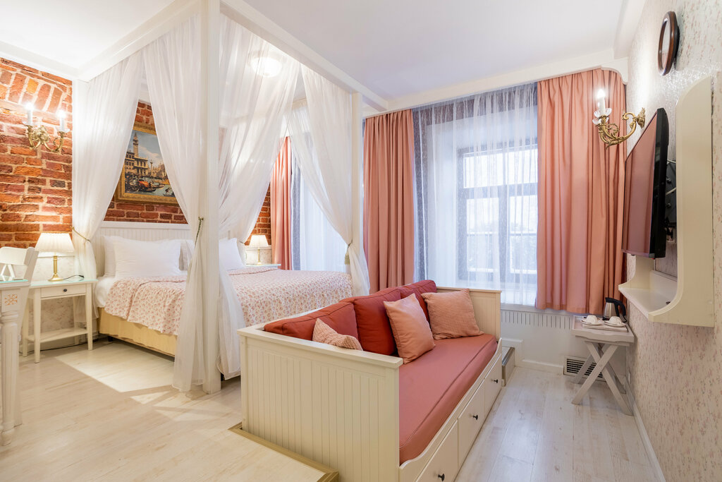 Потрясающий отель. Встречали как родных, провожали тоже. Великолепные завтраки, невероятный интерьер, в номерах уютно и просторно, кровати удобные, я спала как богинюшка. Ресторан при отеле имеет небольшое меню, это очень хороший признак, все максимально свежее, вкусное, приготовлено с душой и большой любовью. Мы жили с маленьким пуделем, к питомцу тоже относились внимательно, поставили мисочки, оставили пеленку и мешочки для какашек. Отель находится почти в самом центре, но в тихом месте, только днем по Крюкову каналу ходят туристические пароходики, слышно бормотание экскурсоводов. В номерах все продумано, каждая мелочь, и это очень радует, не приходится думать ни о чем. Персонал просто чудесный, особая благодарность официантке Анастасии.