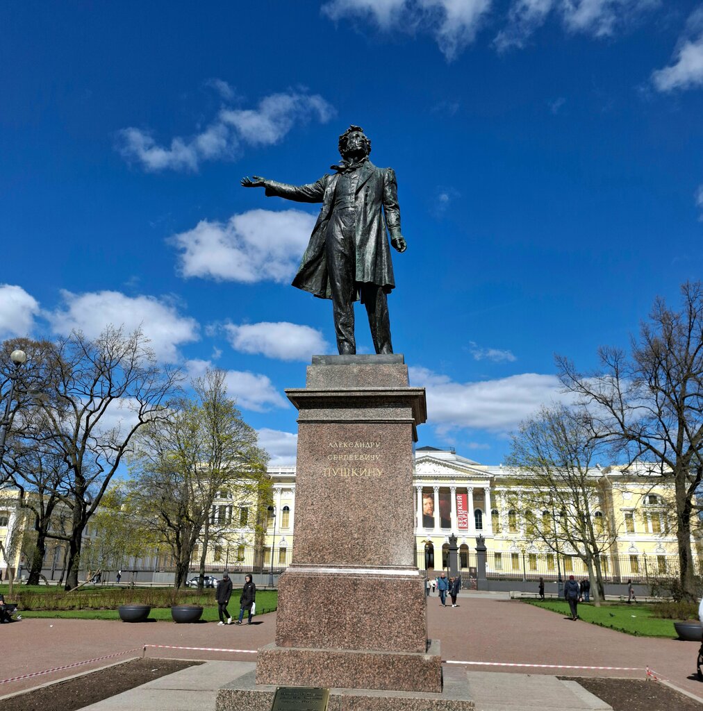 Памятник Александру Сергеевичу Пушкину площади Искусств - детище крополивой и многолетней конкурсной работы лучших скульпторов Ленинграда. Любопытный факт, что в начале был торжественно открыт 6 июня 1949 года закладной камень на месте будущей скульптуры к 150 летию со дня рождения поэта. И лишь спустя несколько лет был установлен гениальный по силе и выразительности памятник работы выдающегося скульптора Михаила Константиновича Аникушина в содружестве с архитектором Василием Александровичем Петровым. Памятник отлит из бронзы на ленинградском заводе «Монументскульптура». На лицевой стороне пьедестала лаконичная надпись: «Александру Сергеевичу Пушкину». Торжественное открытие памятника состоялось 19 июня 1957 года.
