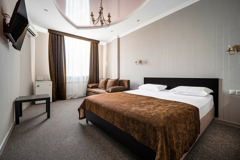 Двухместный номер стандарт в Краснодаре площадью 20 кв.м с видом на город. Подходит для размещения 2 человек. Имеет спальню с приятным интерьером. В номере: 1 двуспальная кровать. Имеется телевизор, кондиционер, отопление, шкаф, вешалка, зеркало...