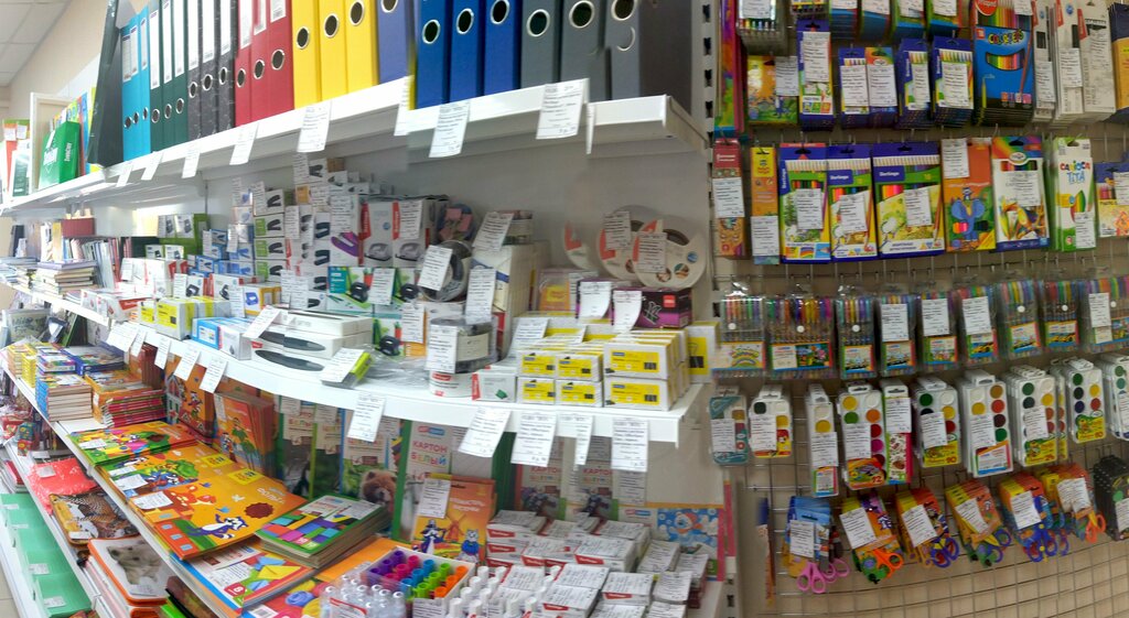A compact store, there is a necessary range of stationery, as well as cash register equipment, cash register paper.There are cupcakes and sheets for drawing in different formats.
