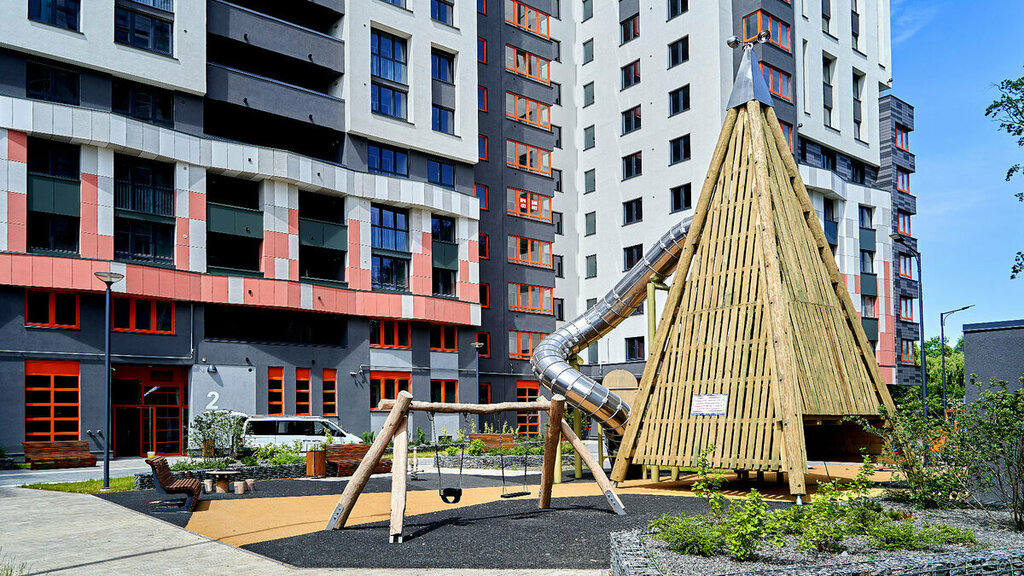 Огороженная территория, задуман как дом без машин, поэтому дети могут безопасно играть во дворе, есть подземная парковка. Много детских площадок для разного возраста, что очень удобно. Знакомая застряла в лифте, но мастер быстро пришёл. На первых этажах есть: и озон, и кондитерская, и спортивная акробатика для детей, и др. Удобно выезжать в сторону моря.