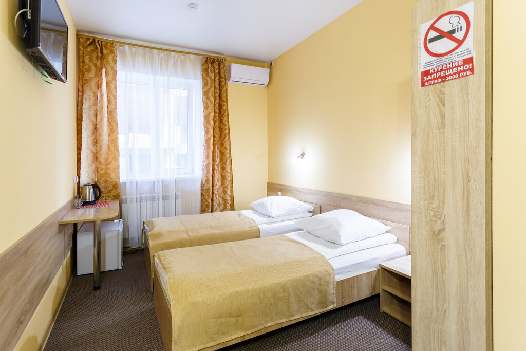 Гостиница хорошая. Проживал в июле, брал стандартный одноместный, с двуспальной кроватью номер. Чисто, полотенца для лица, рук, ног, есть так же дополнительные подушки и одеяла. Кровать была средней удобности, жесткая. В номере телевизор, холодильник, кондиционер, чайник. Сам номер был маленький, не очень удобно по нему маневрировать. Неудобно расположены были розетки (далеко от кровати, щас 21 век, телефон удобнее рядом с кроватью заряжать). Ванная чистая, прилично выглядит. Разочаровало отсутствие одноразовых тапочек, хотя цена приличная, 3500 за ночь без завтрака. Персонал отзывчивый (все справки для командировки делают быстро и без вопросов). Минусы данного заведения - это плохая локация (далеко от центра и от остановок, плюс расположено в спальном районе, можно заплутать) и тонкие стены (в 6 утра проснулся от того, что кто то праздно проводил время в номере, слушая музыку на телефоне и разговаривая, было очень хорошо слышно).