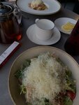 Классический Цезарь с добавлением креветок и томатов черри. Креветки обжариваются до золотистой корочки. Салат отлично дополняют гренки из белого пористого хлеба, хрустящие снаружи и мягкие внутри
