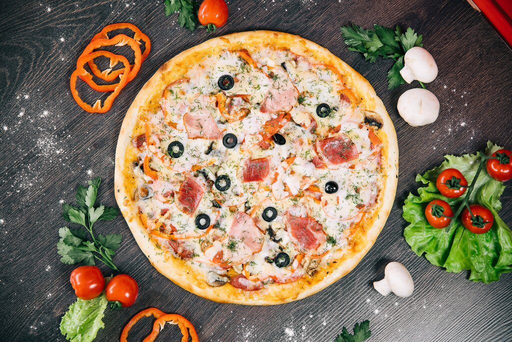 Фирменный соус, ветчина, колбаса варенная, колбаса п/к, колбаски охотничьи, шампиньоны, помидоры, перец сладкий, сыр для пиццы, бекон, маслины