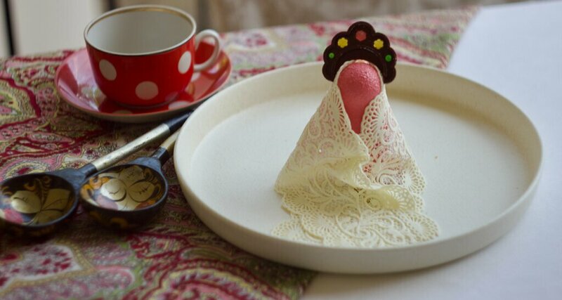 Десерт Матрёшка из сливочного мусса с клубнично-шоколадной начинкой, покрыт марципановой вуалью