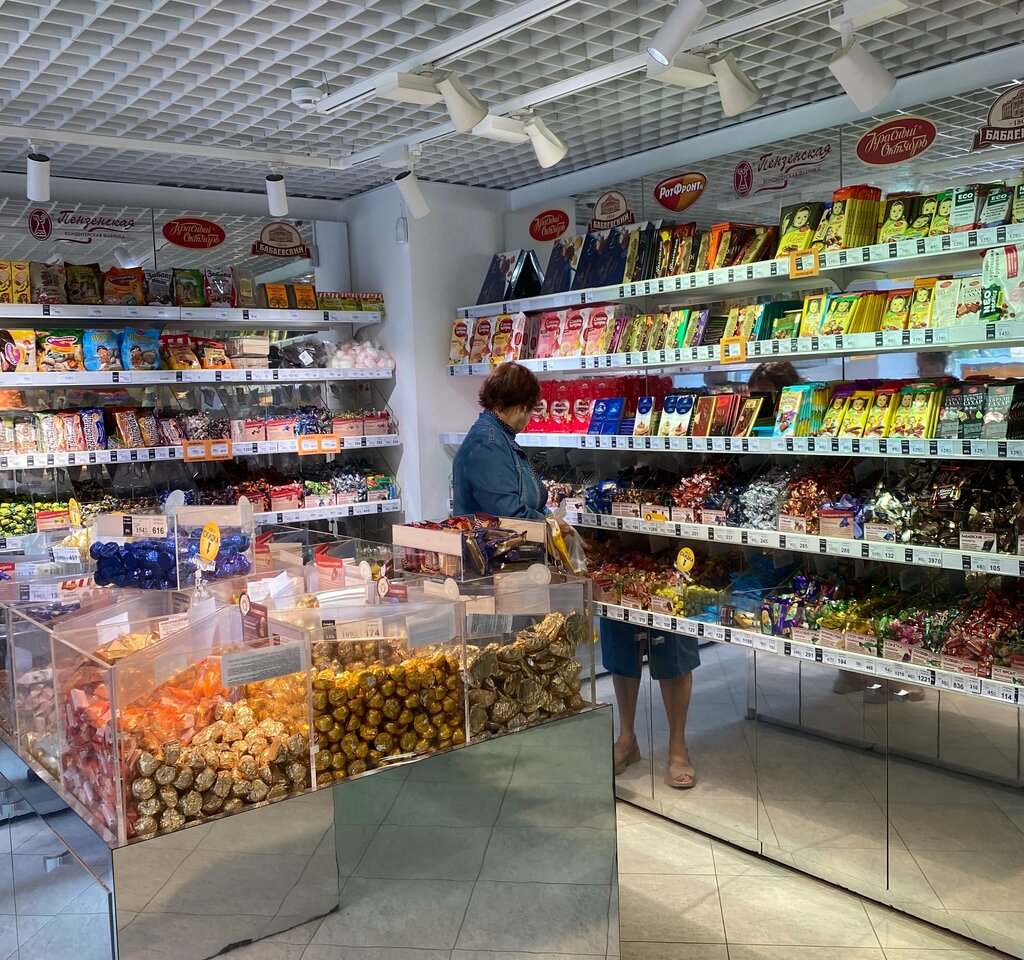 Большой выбор конфет и шоколада, в том числе подарочных коробок и наборов производства Пензенской кондитерской фабрики и других. Цены, на мой взгляд, ниже, чем в сетевых супермаркетах. По дисконтной карте - точно. Парковки, к сожалению, нет - пешеходная зона в самом центре города. От остановок и ближайших парковок - около 500м. Рядом со входом находится популярный в народе памятник ювелиру.