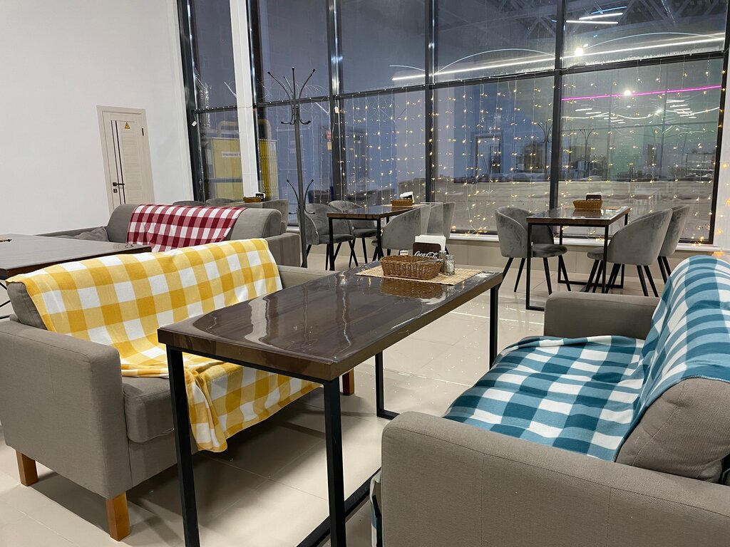 Приехали только вечером, на выезде из города когда уезжали. Ассортимент большой, но все холодное. Разогрели в микроволновке еду, но это все не то. Пюре на воде, в отбивных жилки. Из персонала была только одна женщина и на раздаче и на кассе, при том ещё разговаривала по телефону. Еда как в столовой - не айс!!! Парковка большая. Помещение тоже большое, но уютное