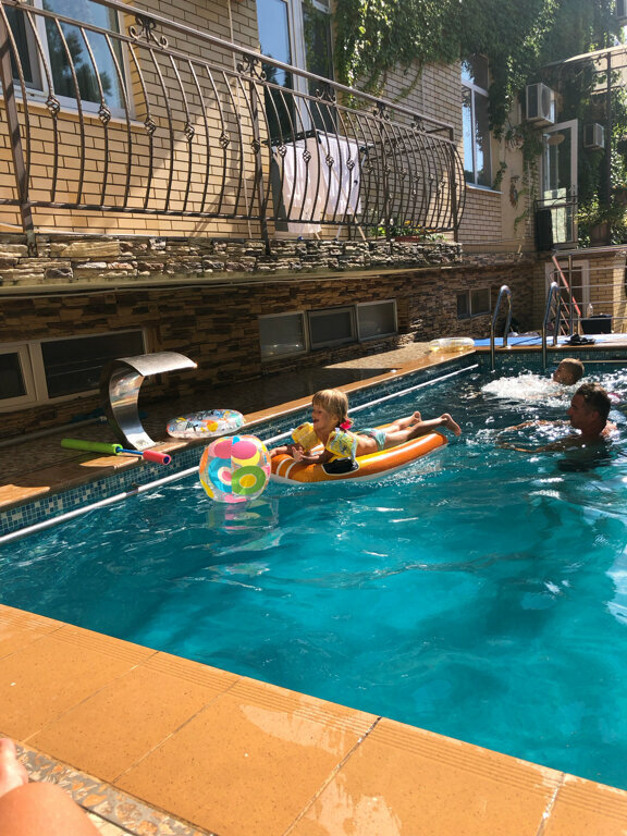 Самый красивый дом в Витязево, фасад дома покрыт зеленым вьюном! После 20-00 в кафе над зонтиками загораются ретро лампочки с теплым светом, включают музыку и начинается вечерний закайфуй 💫 на берегу Черного моря! На территории дома цветут ароматные розы разных сортов и красивые кусты с лавандой 💜 Для детей создан уютный уголок с мягким покрытием, большим батутом, подвесными качелями и контактными живыми цыплятами! Атмосферное пространство, вежливый персонал, вместительный бассейн для детей и взрослых, обстановка по кайфу!)