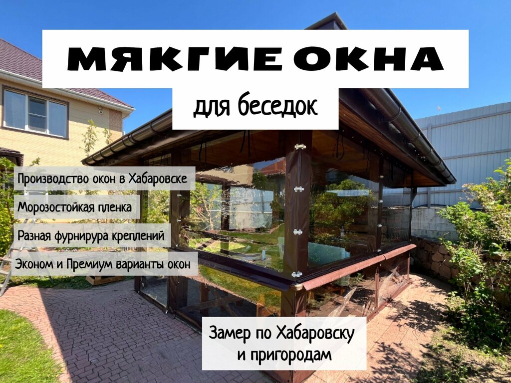 Мягкие окна (гибкие окна) для беседки. * Мягкие окна по Вашим Размерам. Срок готовности от 3-4 дней. * Возможен Наш выезд для замера проемов в Хабаровске и пригородах. (Все подробности по телефону.) * Производство мягких окон находится в Хабаровск...