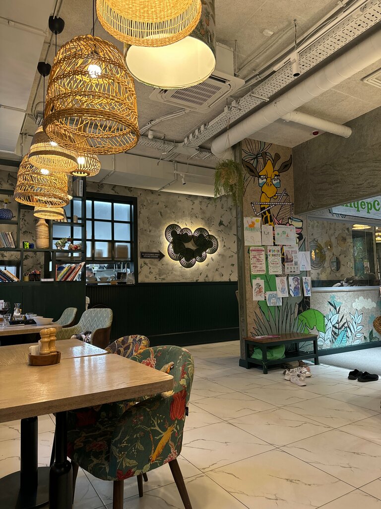 Добрый день! Были в этом кафе большой компанией, места всем хватило, детская комната находится в середине зала, небольшая, но уютная и с детьми занимается аниматор! Есть ещё и игры, книги, так что на любой возраст детей можно найти развлечения! По меню: цены довольно высокие, детское меню не намного отличается по цене от взрослого (хотя в других похожих местах разница ощутима), здесь детские супы в районе 500 руб, взрослые дороже, мы брали детский суп с пельмешками и крем-суп из лисичек. На мой взгляд, порция взрослого супа была небольшая, а цена при этом 650 руб... Заказали ещё чай, взяли со смородиной, очень сладкий оказался, хотя в описании чая сахар не был указан, пришлось несколько раз разбавлять кипятком, чтобы спокойно пить.