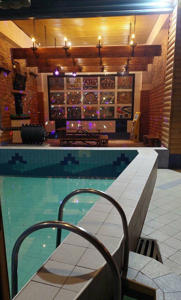 Очень уставшее место. Ошметки краски на потолке, вздувшийся дсп в комнате отдыха. Со светом беда везде. Светильников либо нет, либо они не горят. Над столом полумрак. В бассейне холодная и грязная вода. Видавшие вид полотенца, сланцы и фен. Полотееца и сланцы по 100р за шт. На кухне грязно. Караоке одно название. Непонятный аппарат, микрофон не слышно, 50р 1 песня. Были приглашены на ДР, сама никогда не пошла бы в такое место. Если вы выпить и попарится или по кроватным делам, то нормально. Если для отдыха семьёй, точно нет.