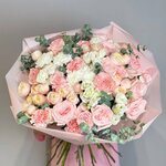 Роскошный и объемный букет сочетает в себе элегантность белых роз и нежность розовых кустовых роз. В комплекте: инструкция с рекомендациями по уходу + средство для продления свежести.