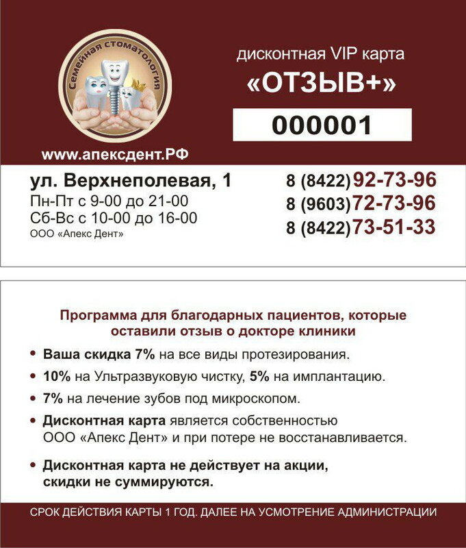 Новость в Стоматологии Апекс Дент Оставь отзыв и получи карту лояльности *Подробнее можно узнать по телефону, указанному в профиле
