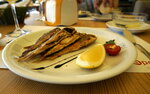 Где на набережной Ялты поесть, вопрос слишком остро не стоит, кафе и ресторанов хватает. А насчет что поесть, тут уж дело каждого. Будучи у моря, не вкусить жареной барабульки — непростительно. Чтоб румяной была и лимончиком сдобренная, да под бокальчик вина… Сказка да и только! Такую горочку аппетитной и ароматной рыбешки, уходящей в лет, можно откушать, например, в «Апельсине» на набережной. В разных местах её готовят, конечно, по-разному, но здесь она дивно хороша! Слова тут излишни, рыбку надо просто есть и наслаждаться. Теперь что касается самого заведения, похожего на ладью или галеру над водой. Плюсами можно считать рыбное меню (кроме консервированного тунца), панорамный вид, уютную обстановку, достаточные порции с кучей зелени и быстрое обслуживание. А минусами — приветливость официантов определяется щедростью чаевых, это при том, что цены и так крутоваты. И еще в ресторане, работающем лишь в высокий сезон, всегда слишком ветрено, даже в теплый день. Да вентиляторы, непонятно зачем, включают, нам даже пришлось воспользоваться пледами, а есть, закутавшись, не очень-то удобно. В целом же заведение хорошее и к посещению рекомендовано.
